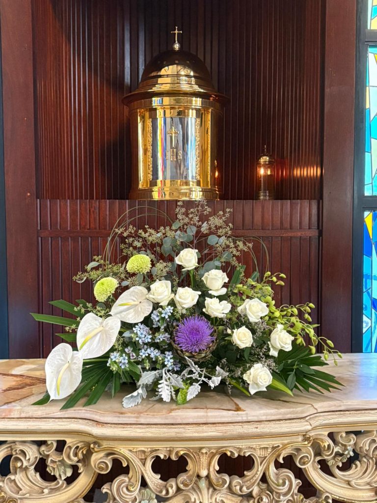 The Liturgical colour theme is green for Ordinary Time. Our flower arrangements this week are composed of the colours green with a pinch of blue and white.
