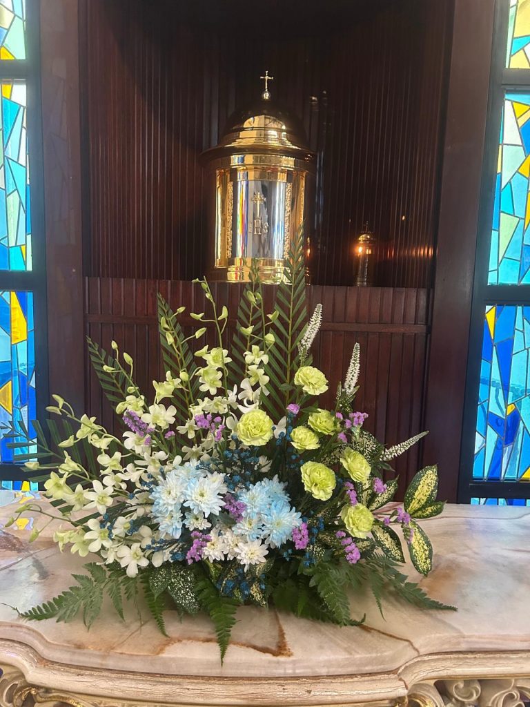 The Liturgical colour theme is green for Ordinary Time. Our flower arrangements this week are composed of the colours green with blue, a pinch of purple, and white.