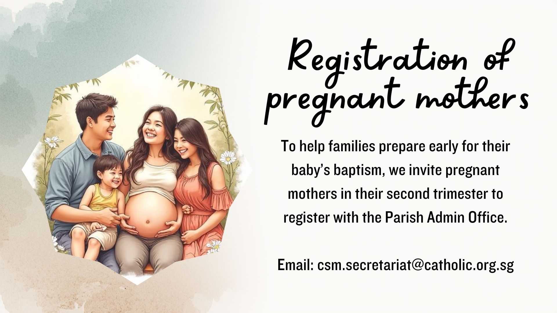 To help families prepare early for their baby’s baptism, we invite pregnant mothers in their second trimester to register with the Parish Office.