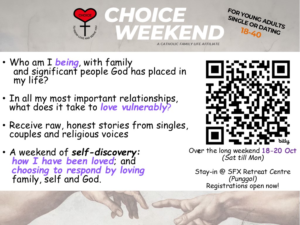 Get in touch with Catholic Family Life to find out more, contact us at 64880278 or email michelle@catholicfamilylife.sg. If you are interested to volunteer with us, do fill up the volunteer form: https://bit.ly/CFL-volunteer-form and we will get in touch with you.