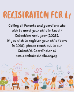 Calling all Parents and guardians who wish to enrol your child in Level 1 Catechism next year (2026). If you wish to register your child for 2026 (for those born in 2019), please reach out to our Catechist Coordinator at csm.admin@catholic.org.sg.
