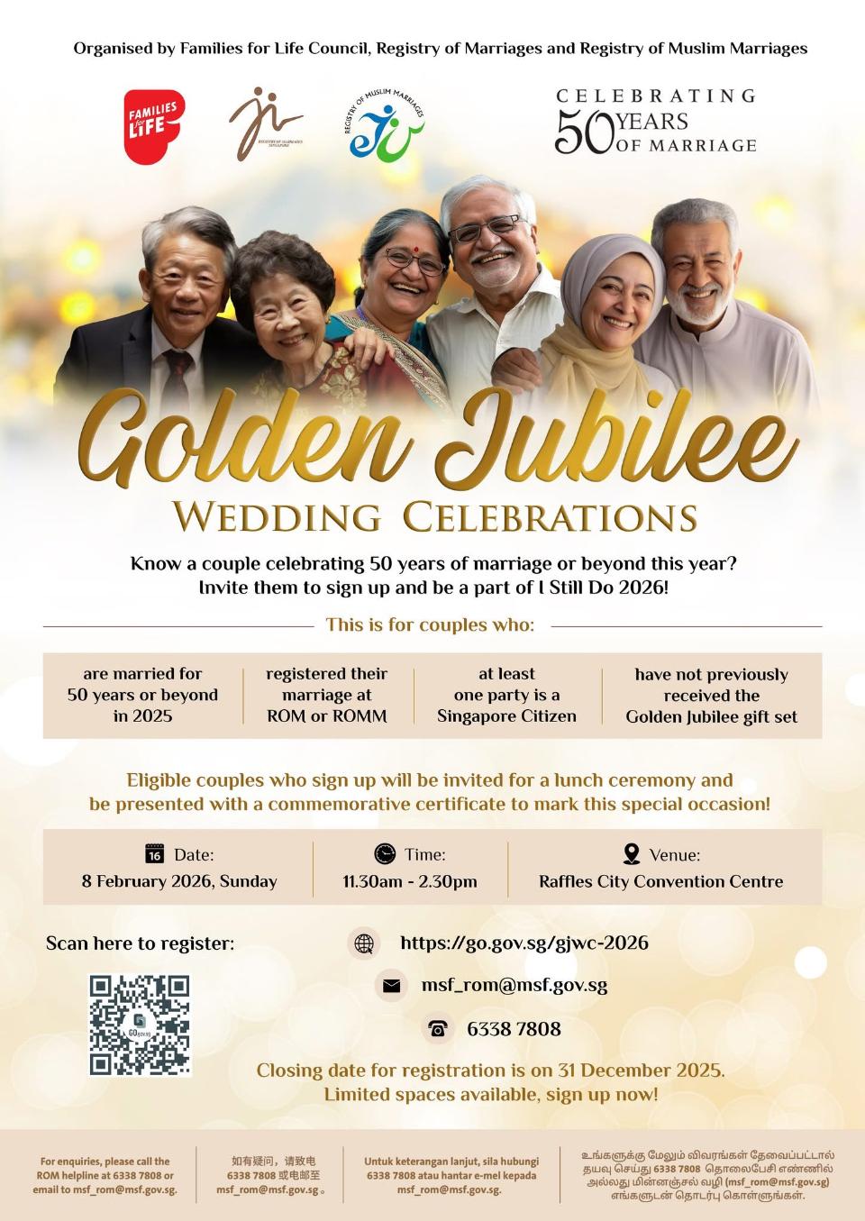 - Have not received the Golden Jubilee commemorative package previouslyIf you know of couples who are eligible, you could nominate them by completing the registration form at the following link (www.go.gov.sg/gjwc-2026) or by scanning the QR code in the attached poster. Couples, their family members or friends can also register their interest via the same link / QR code.
