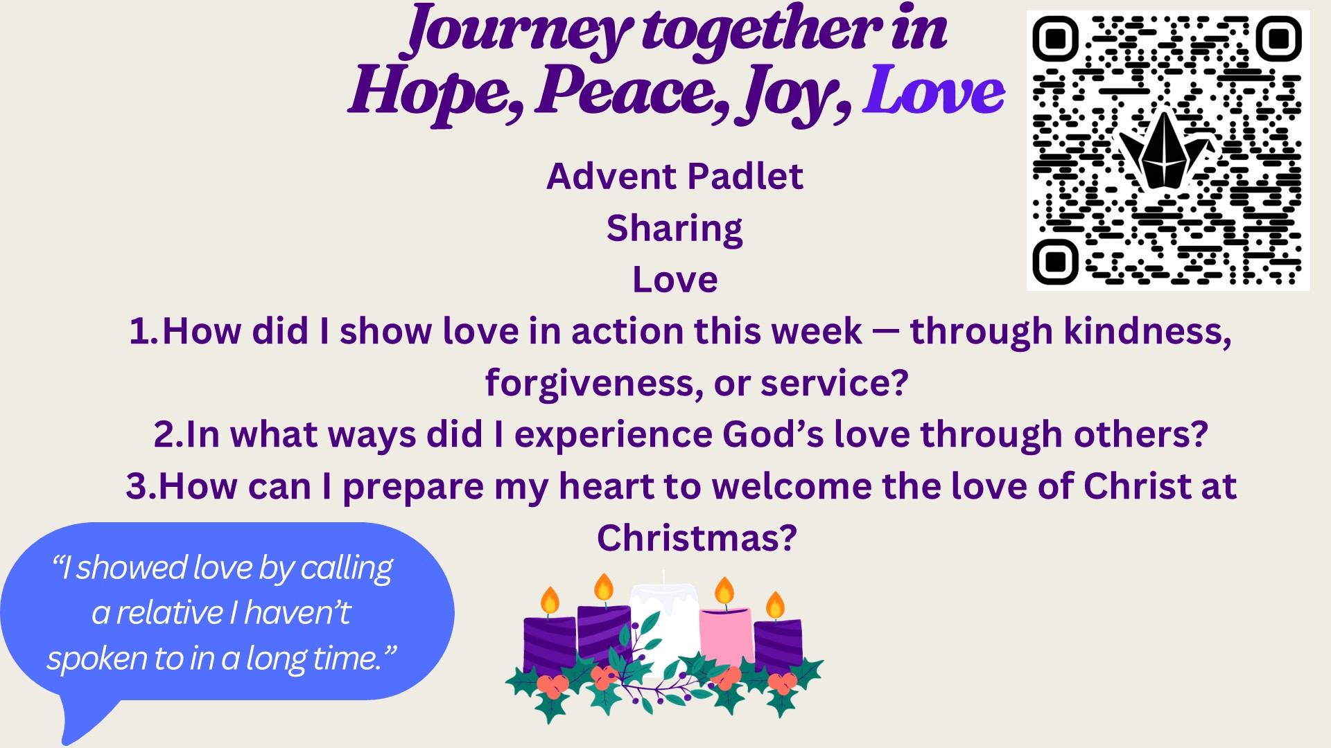 Let’s take some time to reflect on the 3 questions for this advent in the slide above.