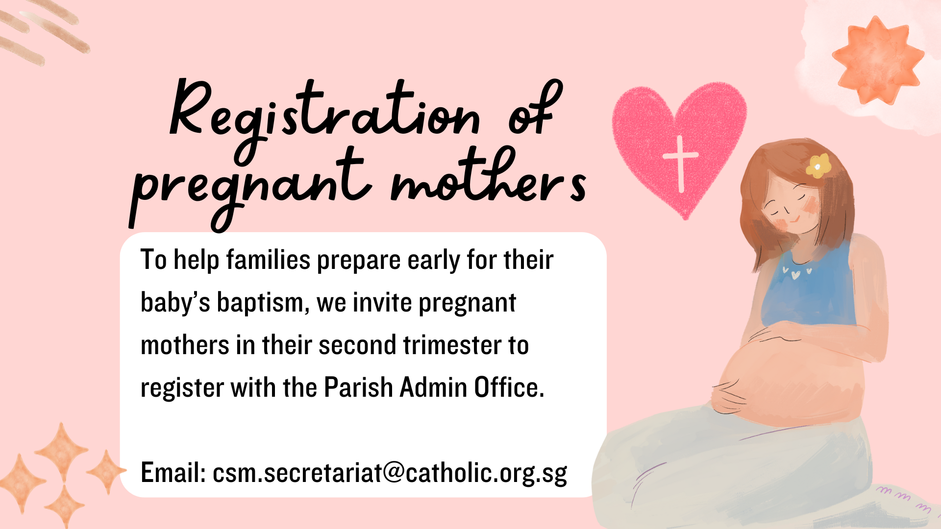 To help families prepare early for their baby’s baptism, we invite pregnant mothers in their second trimester to register with the Parish Admin Office.